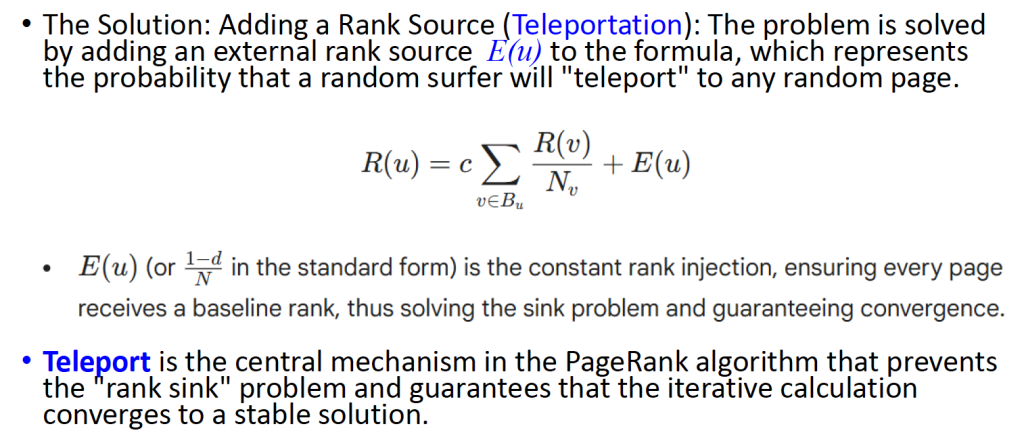 - Problem:In the random surfer model (used by PageRank), the surfer gets “stuck” here, leading to non-convergence or rank leakage.