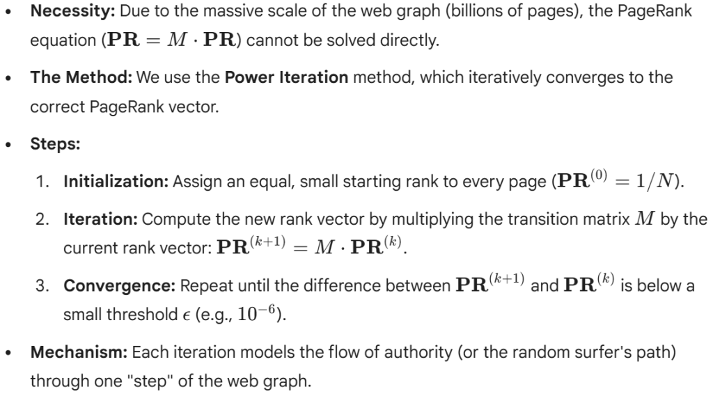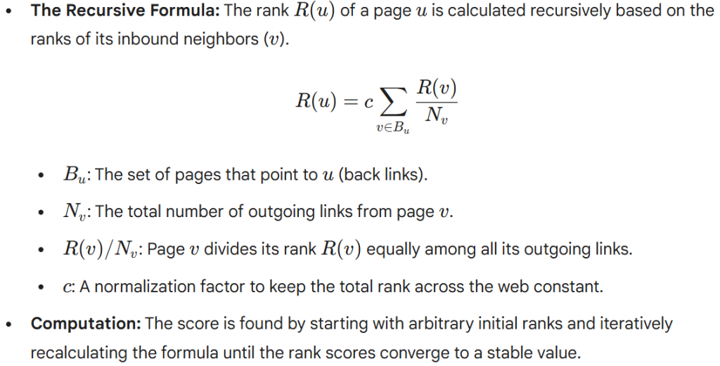 - Recursive Definition:The rank of a page depends on the ranks of the pages linking to it. This recursive dependency forms the basis of the calculation.