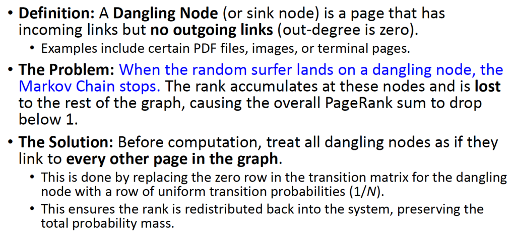 - Solution:Algorithms handle these nodes by assuming a jump (teleportation) to a random page.