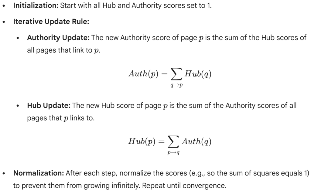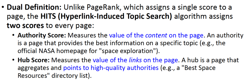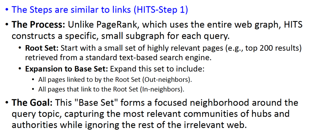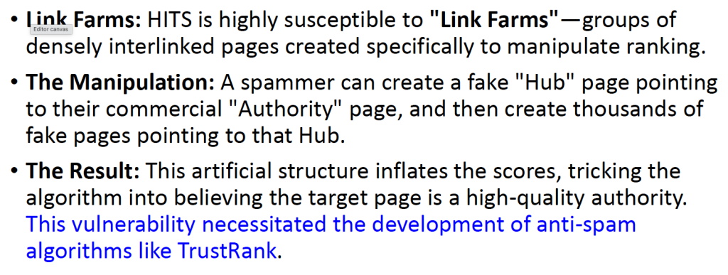 - The Problem with HITS:The original HITS algorithm is vulnerable to the “Tightly Knit Community” (TKC) effect, where a small group of mutually linking pages (even if irrelevant) can dominate the results.