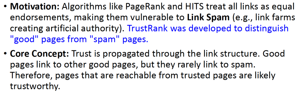 - Spam Mass:By comparing a page’s standard PageRank with its TrustRank, we can estimate its “Spam Mass”—the portion of its rank likely derived from manipulation.