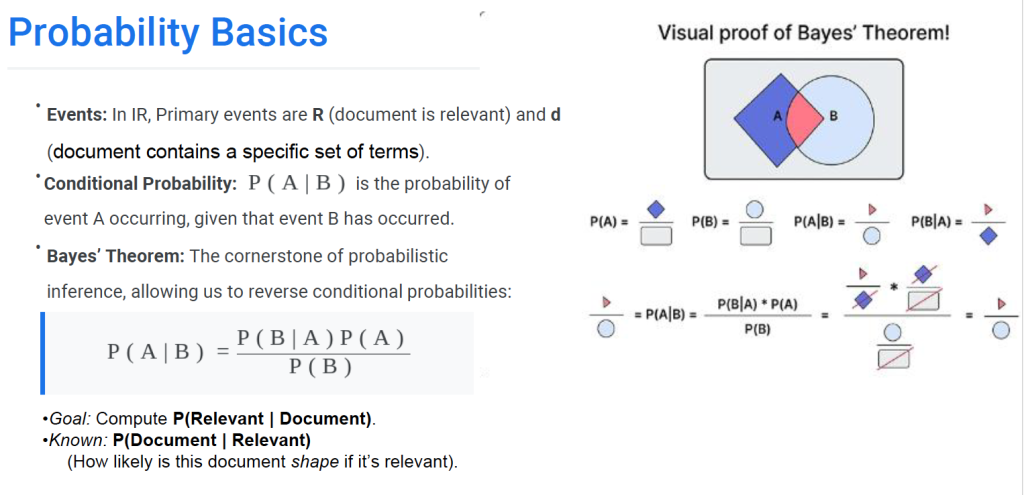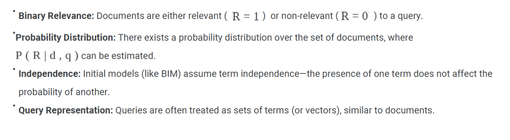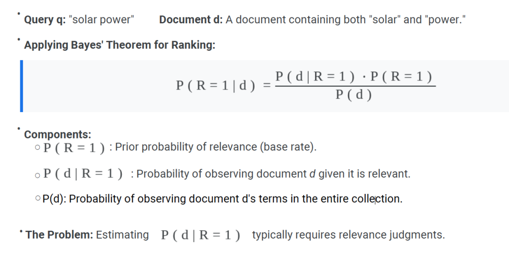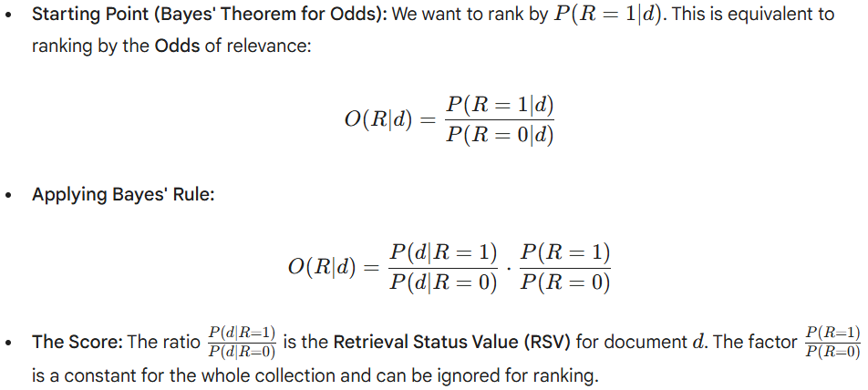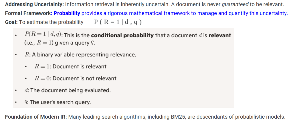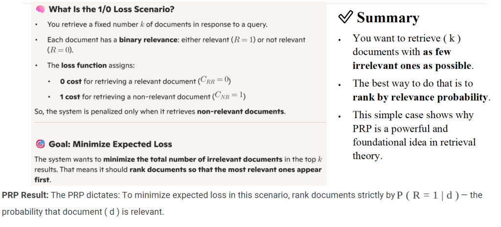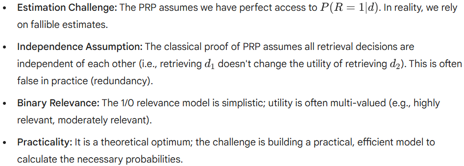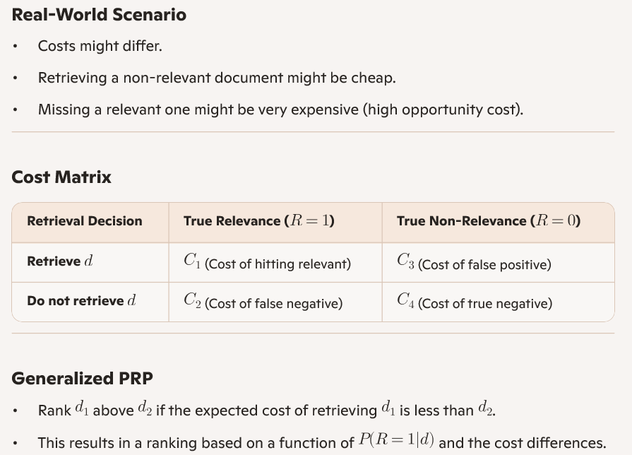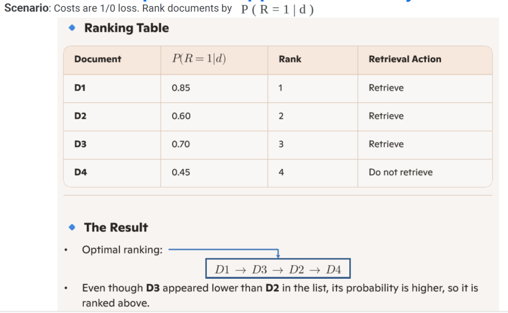 - Core Principle: If a retrieval system’s goal is to maximize the overall utility (or minimize the expected loss) of the retrieved set, then the documents should be ranked in order of decreasing probability of relevance.