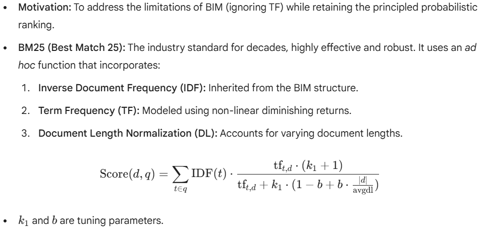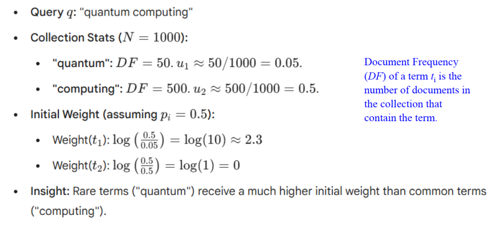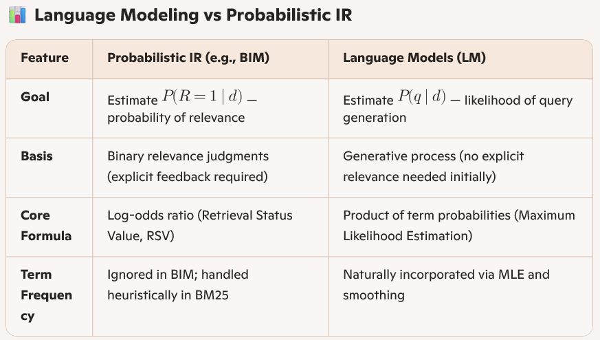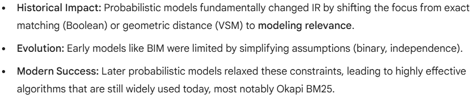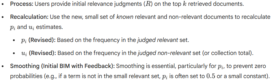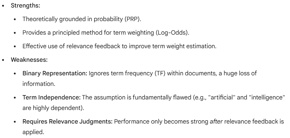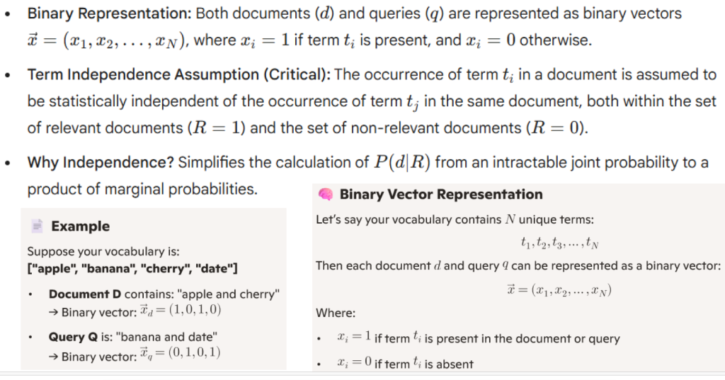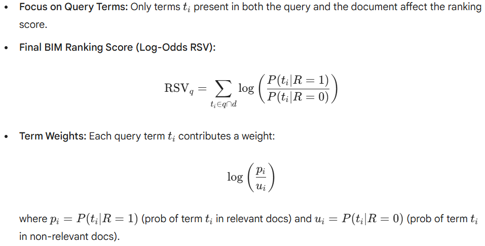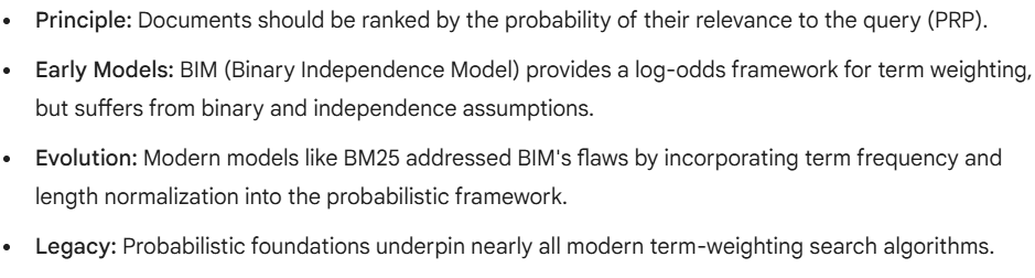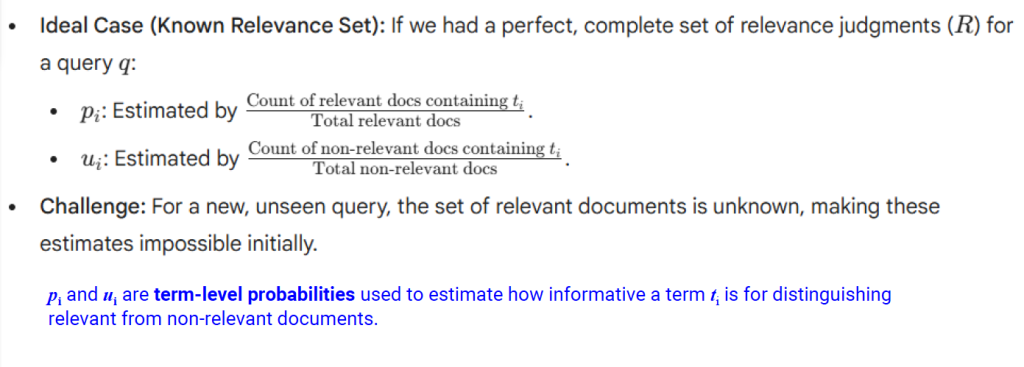 - Core Principle: If a retrieval system’s goal is to maximize the overall utility (or minimize the expected loss) of the retrieved set, then the documents should be ranked in order of decreasing probability of relevance.